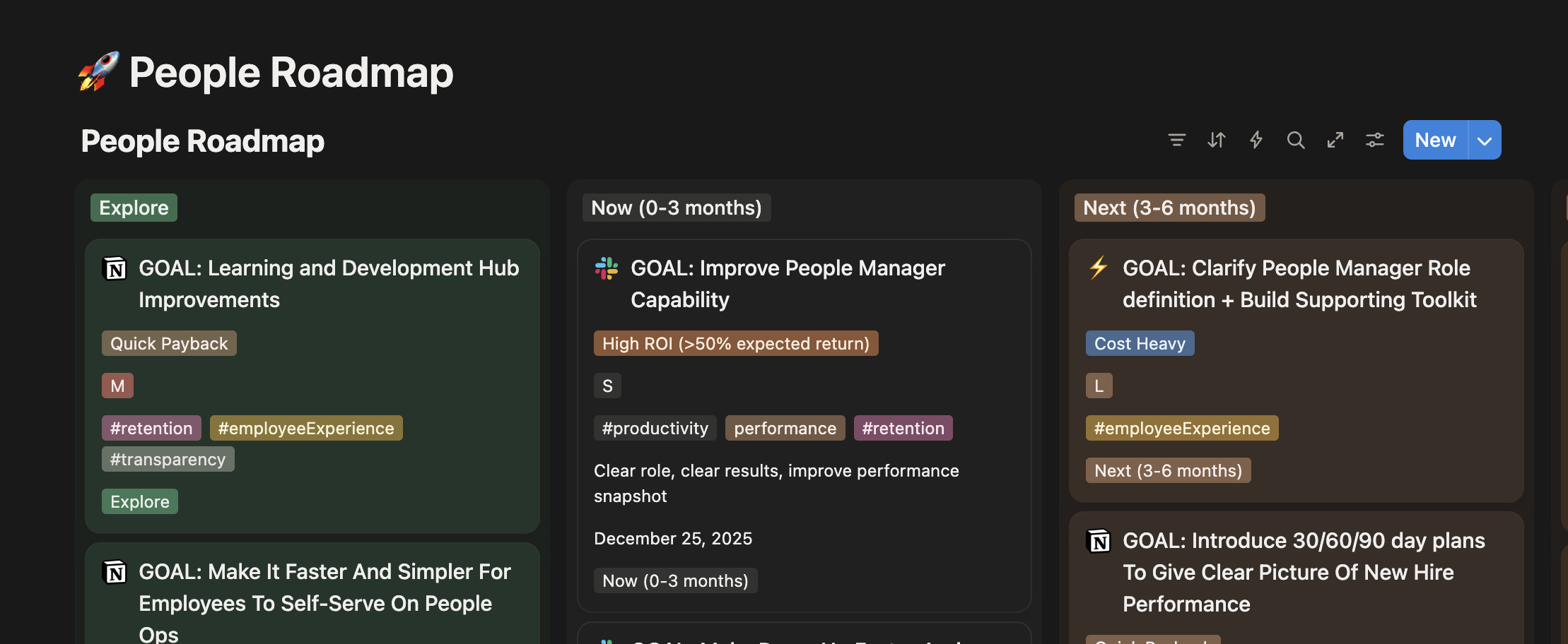 This is a super simple kanban style people & culture roadmap template we built on Notion for startup people teams.